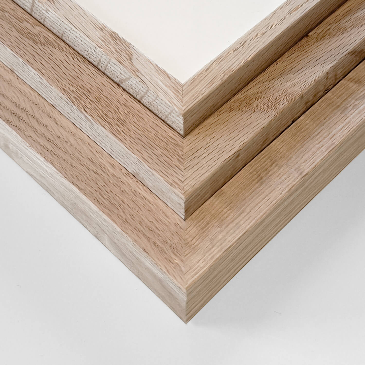 Vi tilbyder massive egetræsrammer i tre forskellige profiler, som alle er lavet med træ fra de samme canadiske skove. De ligner derfor hinanden, selvfølgelig med samme naturlige uforudsigelighed i strukturen.